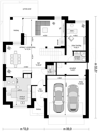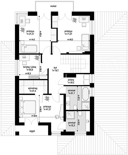 Projekt domu Kasjopea 7 B jest wersją wariantową popularnego projektu Kasjopea 7 z wyższym kątem nachylenia dachu, co może być ułatwieniem dla Inwestorów, na których działkach warunki urbanistyczne nakazują budowę domu z wyższym dachem. Projekt domu Kasjopea 7 B Projekt domu Kasjopea 7 B jest energooszczędny, zastosowano w nim najnowsze materiały i instalacje. Budynek ma dość prostą konstrukcję - będzie łatwy i szybki w budowie. Dzięki zwartej bryle i dobrym izolacjom będzie też tani w późniejszej eksploatacji. Projekt dostępny jest w odbiciu lustrzanym oraz kilku wersjach: podstawowa ( to projekt domu jednorodzinnego, piętrowego. Jego prostokątna piętrowa bryła przykryta jest czterospadowym dachem. Do głównej bryły dobudowana jest parterowa część nad garażem i dodatkowym pokojem przekryta trzyspadowym dachem. Elewacje domu podzielono na poziome pasy. Ściany parteru są boniowane - ściany piętra tynkowane na gładko. Duże przeszklenia, loggia, podcienie , balkon - stanowią elementy ozdobne urozmaicające zewnętrzną sylwetkę budynku. Zastosowane nowoczesne materiały w stonowanych kolorach tworzą elegancki, powściągliwy efekt. Dom, jako podmiejska willa, doskonale wpasuje się w otoczenie innych zabudowań. Wnętrze budynku podzielono na następujące części: przestrzeń dzienną i gospodarczo garażową na parterze, oraz sypialnie na piętrze. Do domu wchodzimy przez przedsionek połączony z garażem i przechodzimy na wprost do połączonej otwartej powierzchni holu, salonu z jadalnią i kuchni. Salon i jadalnia otwierają się dużymi przeszkleniami na częściowo zadaszony taras, oraz ogród. Wygodna kuchnia z kącikiem na szybkie posiłki jest częściowo wizualne oddzielona od reszty wnętrza. Reprezentacyjne schody stanowią ozdobę wnętrza domu. Za schodami niewielkim korytarzem przechodzimy do dodatkowego pokoju (gabinet, lub sypialnia gościnna) i łazienki. Z kolei z dwustanowiskowego garażu przechodzimy do kotłowni. Na piętrze do dyspozycji mamy cztery pokoje, w tym: apartament rodziców, z własną łazienką, garderobą i tarasem, oraz trzy sypialnie dzieci (jedna mniejsza) z łazienką i pralnią dostępną z holu. Nad piętrem mamy jeszcze do dyspozycji spory strych - dodatkową przestrzeń magazynową domu. projekt domu Kasjopea ) i jej wersja odświeżona ( projekt domu Kasjopea 8 ), bliźniak ( projekt domu Kasjopea 2 ), ze zmienionym układem pomieszczeń ( projekt domu Kasjopea 3 ), pomniejszona ( projekt domu Kasjopea 4 ), komfortowa ( projekt domu Kasjopea 5 ), największa ( projekt domu Kasjopea 6 ) i z nowocześniejszą architekturą ( projekt domu Kasjopea 7 ).